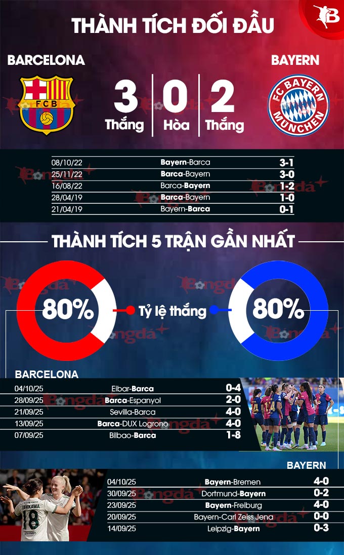 - Hai đội cùng ghi bàn: Nữ Barca đã thành công trong việc ghi bàn ở 5 trận chính thức mới đây, còn với nữ Bayern là ở 4/5 trận vừa qua. Chưa hết, nữ Barca cũng ghi bàn ở 8 trận chính thức trên sân nhà gần nhất, còn nữ Bayern làm được điều tương tự ở 8 trận sân khách vừa qua. Với xu hướng như vậy, khả năng cao hai đội sẽ cùng tìm được đường vào khung thành của nhau.