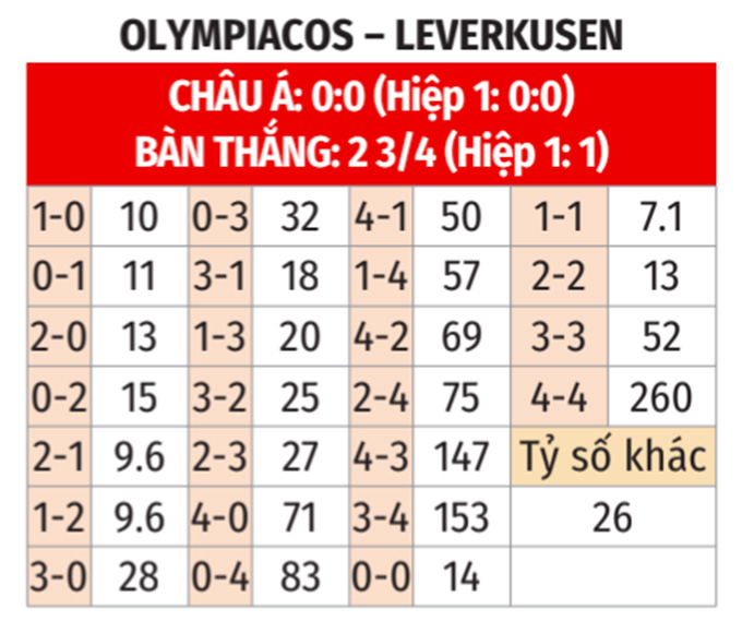- Chẵn bàn thắng: Cả hai cuộc đối đầu giữa hai đội, cả 6 trận gần đây của Olympiacos vs 7/11 trận vừa qua của Leverkusen đều có tổng bàn thắng là chẵn. Ngoài ra, 4/6 chuyến làm khách gần nhất của Leverkusen cũng khép lại với tổng bàn thắng chia hết cho 2.