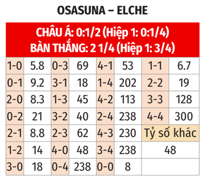 - Chẵn bàn thắng: 7/9 cuộc đối đầu gần nhất, 3/4 trận sân nhà chính thức gần đây của Osasuna và 5/6 trận gần đây của Elche đều khép lại với tổng bàn thắng là chẵn. Đặc biệt, cả 5 chuyến xa nhà vừa qua của Elche đều có tổng bàn thắng chia hết cho 2.