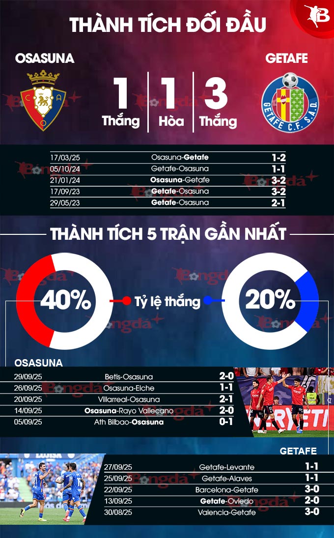Trên sân nhà El Sadar, Osasuna đang có thành tích đối đầu nhỉnh hơn đôi chút so với Getafe, khi giành 5 chiến thắng, hòa 6 và chỉ nhận 2 thất bại ở 13 trận gần nhất trên mọi đấu trường.