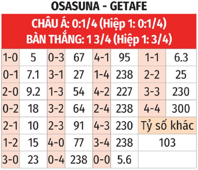- Osasuna thắng châu Á hiệp 1: Osasuna tận dụng rất tốt ưu thế sân nhà để tìm kiếm bàn thắng sớm, khi thắng 9/10 trận gần đây ngay trong 45 phút đầu. Với Getafe, đội bóng này thua hiệp 1 ở 2 trận vừa qua trên sân khách cũng như 2 chuyến viếng thăm sân El Sadar gần nhất.