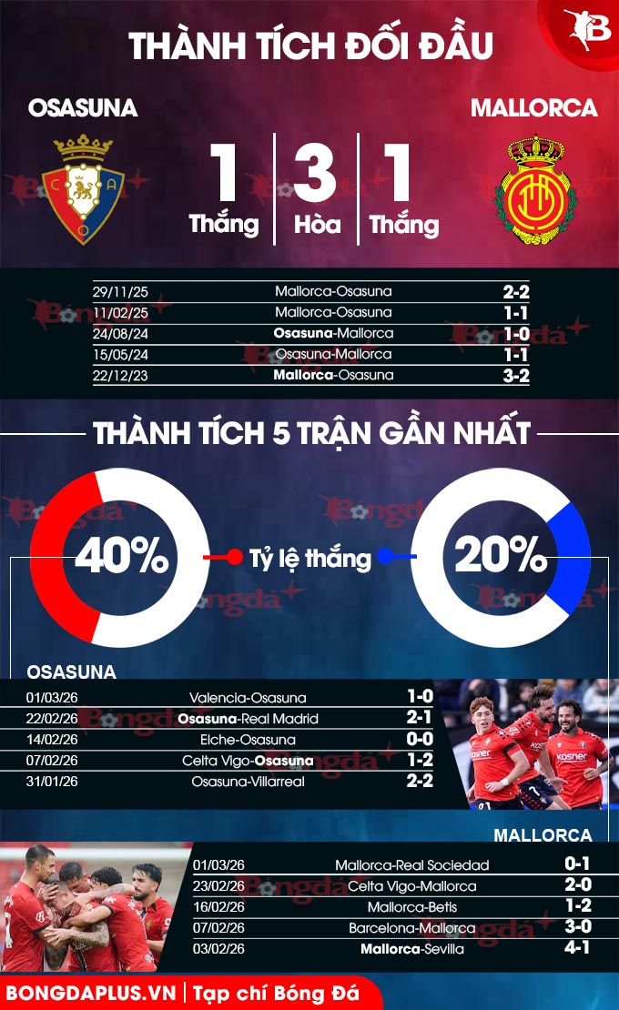 - Nhiều bàn thắng: 6/8 trận gần đây của Osasuna cùng 7/9 trận vừa qua của Mallorca đều có ít nhất 3 bàn thắng được ghi. Trận đối đầu ở lượt đi đã có tới 4 bàn thắng được ghi.