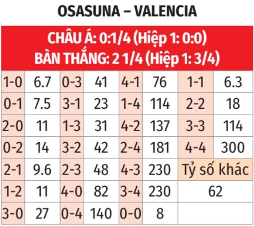 - X phạt góc: 5/6 trận đấu gần đây của Osasuna chỉ có tối đa 9 quả phạt góc. Tình trạng tương tự xảy ra ở 5/8 trận gần nhất của Valencia.