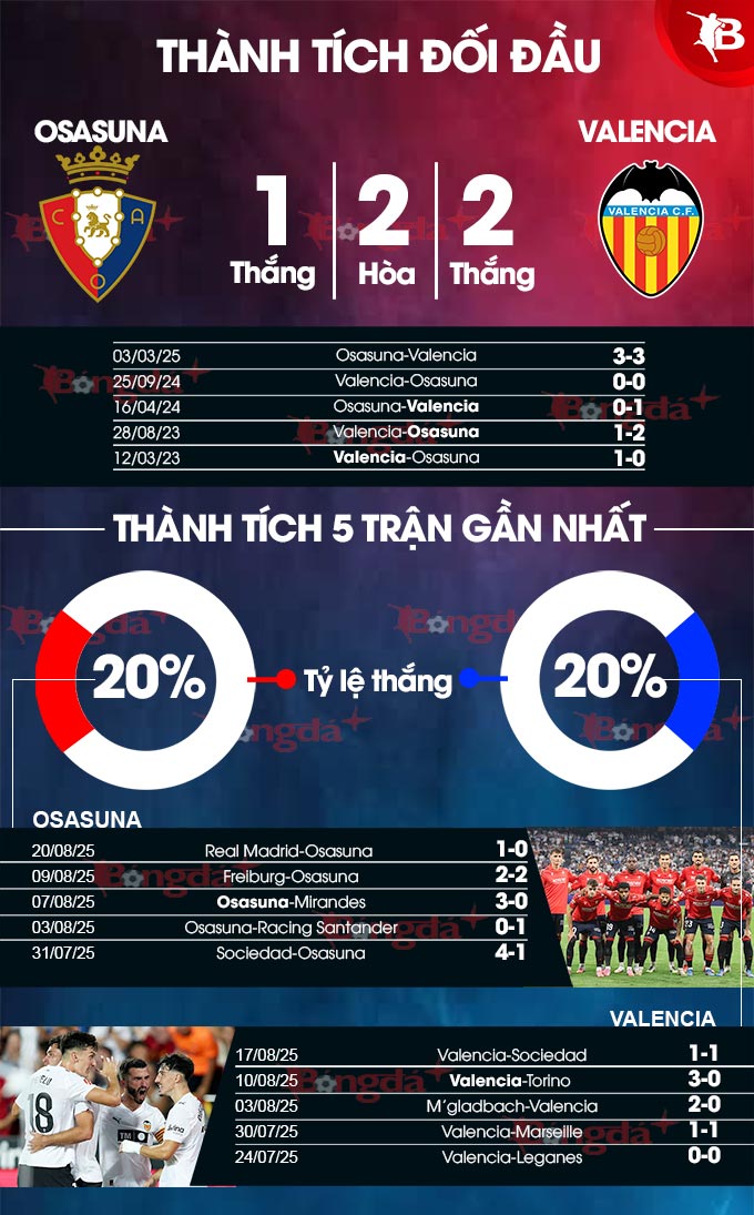 Valencia cũng không xem sân El Sadar cũng không phải là điểm đến đáng sợ. Theo thống kê, họ bất bại trong 4 lần gần nhất hành quân đến sân của Osasuna, trong đó giành 3 chiến thắng, trong đó có 3 trận Valencia ghi được từ 2 bàn trở lên vào lưới của đội chủ nhà.