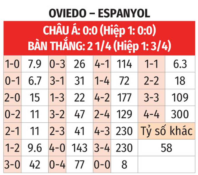 Oviedo có lợi thế sân nhà và thắng 2/6 trận gần nhất tại nơi đây, còn Espanyol lại đang chơi dở ở sân khách khi không thắng 6 trận mới đây.