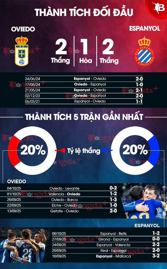 Dù vậy, cả Oviedo và Espanyol đang có thành tích đối đầu cân bằng, khi mỗi đội thắng 2 trận, kèm theo 1 trận hòa. Do đó, có khả năng, màn so T sắp tới sẽ bất phân thắng bại.