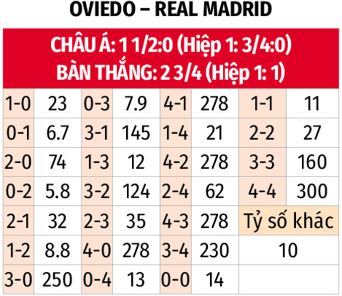 - Real Madrid thắng kèo hiệp 1: Các cầu thủ Real giành chiến thắng 4/7 trận đấu gần đây ngay trong 45 phút đầu tiên. Với Oviedo, trận đấu đầu tiên khi trở lại La Liga chứng kiến họ thua sấp mặt 2 bàn trước Villarreal ngay trong hiệp đầu.