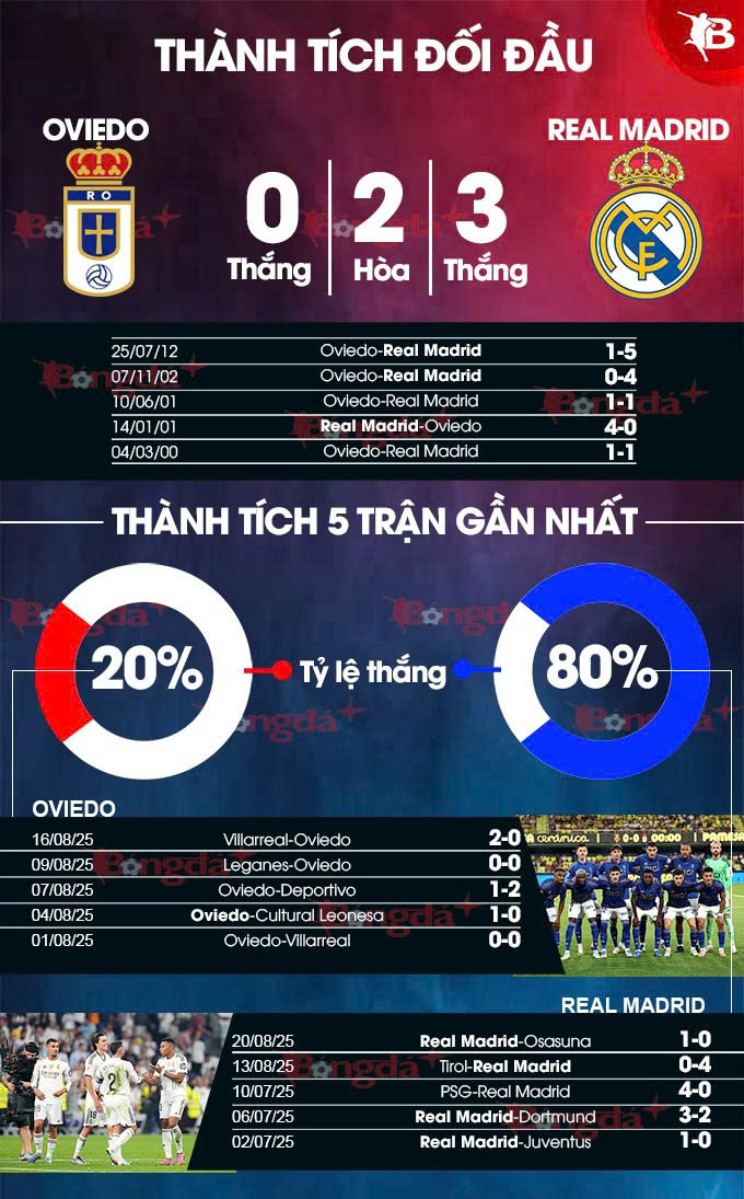 Real Oviedo chỉ thắng 14 trong số 85 trận đối đầu trong quá khứ với Real Madrid, để thua 55 trận, bao gồm cả trận thua 0-4 khi hai đội đối đầu nhau lần cuối tại cúp Nhà vua Tây Ban Nha vào tháng 11/2022. Điều NHM chủ nhà níu giữ chút niềm tin là 3/4 trận đấu gần nhất tại La Liga đã kết thúc với tỷ số hòa.