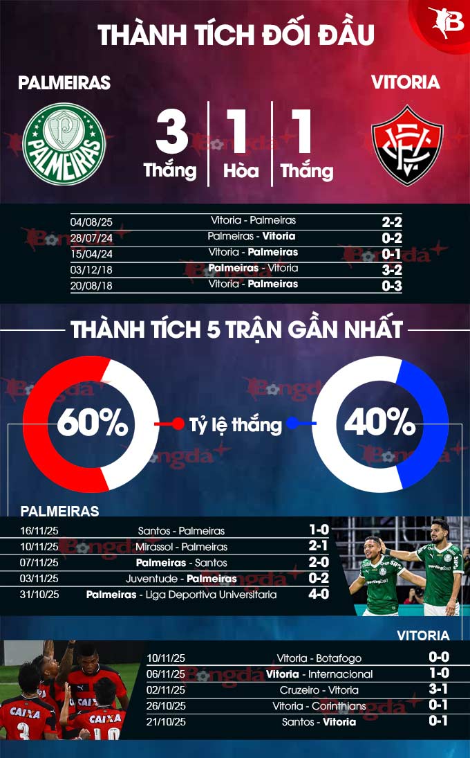 Thầy trò HLV Abel Ferreira cũng xuyên thủng lưới đối phương trong hiệp 1 ít nhất 1 lần ở 7/10 trận sân nhà vừa qua và duy trì chuỗi 12 trận bất bại tại quê nhà, trong đó có 2 trận hòa và 10 chiến thắng. Nếu chỉ tính riêng tại giải VĐQG Brazil 2025, Palmeiras đang có chuỗi 12 trận bất bại trên sân nhà (2 hòa, 10 thắng). Đây là một trong những lý do Palmeiras rất tự tin khi đón tiếp Vitoria lần này.