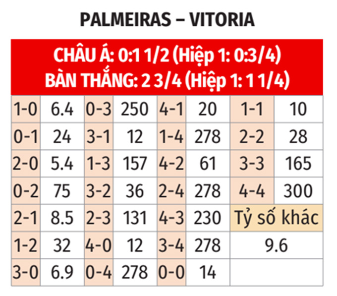 - Từ 2 bàn trở lên trong hiệp 1: 8/12 trận gần nhất của Palmeiras đều có ít nhất 2 bàn trong hiệp đấu đầu tiên. Kịch bản tương tự cũng xảy ra trong hiệp 1 ở 4/6 trận sân nhà gần đây của Palmeira và ở 2/3 chuyến làm khách vừa qua của Vitoria.