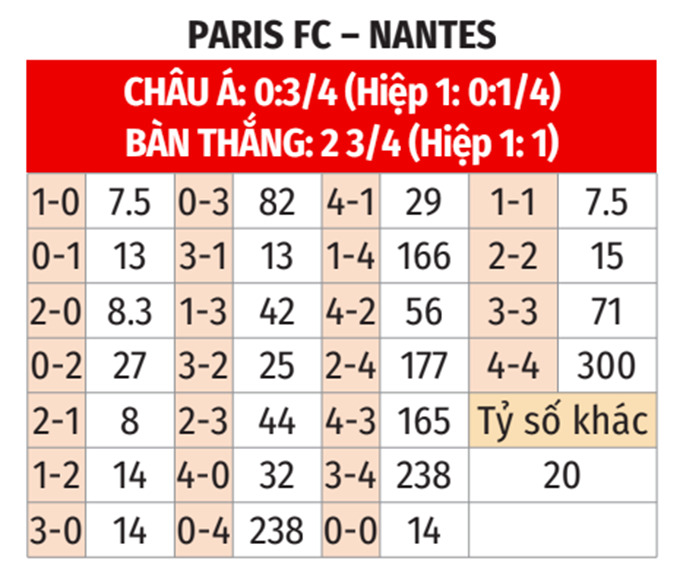 - Từ 3 bàn trở lên: Cả 2 lần đối đầu giữa hai đội, 6/8 trận gần đây của Paris FC và 3/4 trận sân nhà vừa qua của Paris FC đều khép lại với ít nhất 3 bàn cả trận. Xem ra trận này khó có ngoại lệ.