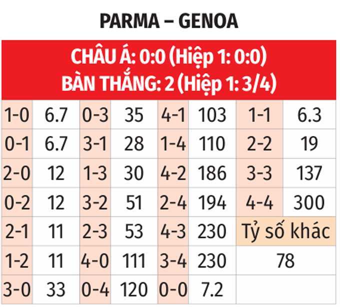 - Chẵn bàn thắng: 7/10 trận so T gần nhất giữa 2 CLB có tổng bàn thắng chia hết cho 2. Ngoài ra, 7/10 trận vừa qua của Parma cùng 6/7 trận vừa xong của Genoa cũng có tổng bàn thắng là số chẵn. Chưa hết, 6/8 trận Parma tiếp Genoa trên sân nhà đều chứng kiến điều tương tự.