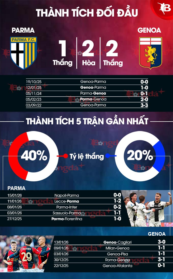 Trên sân nhà, Parma cũng không quá hay khi chỉ thắng 2/5 trận gần nhất còn Genoa kém hơn chút khi mới có 1 lần được hưởng niềm vui trong cùng thời gian. Với tình hình hiện tại, có khả năng, đôi bên sẽ chơi chặt chẽ. Hòa sẽ là hợp lý ở trận này.