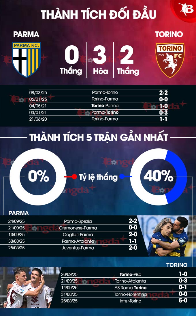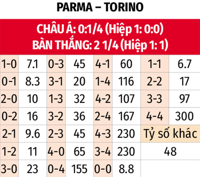 - Tối đa 1 bàn hiệp 1: Lịch sử đối đầu chứng kiến 4 trận gặp nhau gần nhất giữa hai đội chỉ xuất hiện 2 bàn thắng, với 2 trận hòa 0-0. 4/6 trận chính thức từ đầu mùa của Parma cũng kết thúc hiệp đầu với tỷ số 0-0. Với Torino, hàng công đội khách tịt ngòi 5/6 trận vừa qua trong 45 phút đầu tiên.