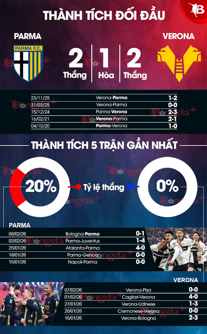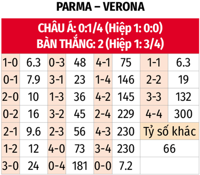 - Tối đa 2 bàn thắng: Những trận đấu sân nhà của Parma thời gian qua thường diễn ra với thế trận rất chặt chẽ và kín kẽ, khi 5 trận liên tiếp gần đây có tối đa 2 bàn thắng được ghi. Với Verona, các chân sút đội khách tịt ngòi 3/4 trận vừa qua.