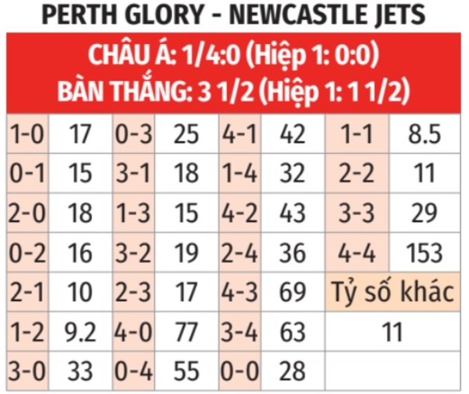 - Lẻ bàn thắng: 8/10 trận gần đây của Perth Glory kết thúc với tổng số bàn thắng là số lẻ. Tình trạng tương tự xảy ra ở 5 trận vừa qua của Newcastle Jets.