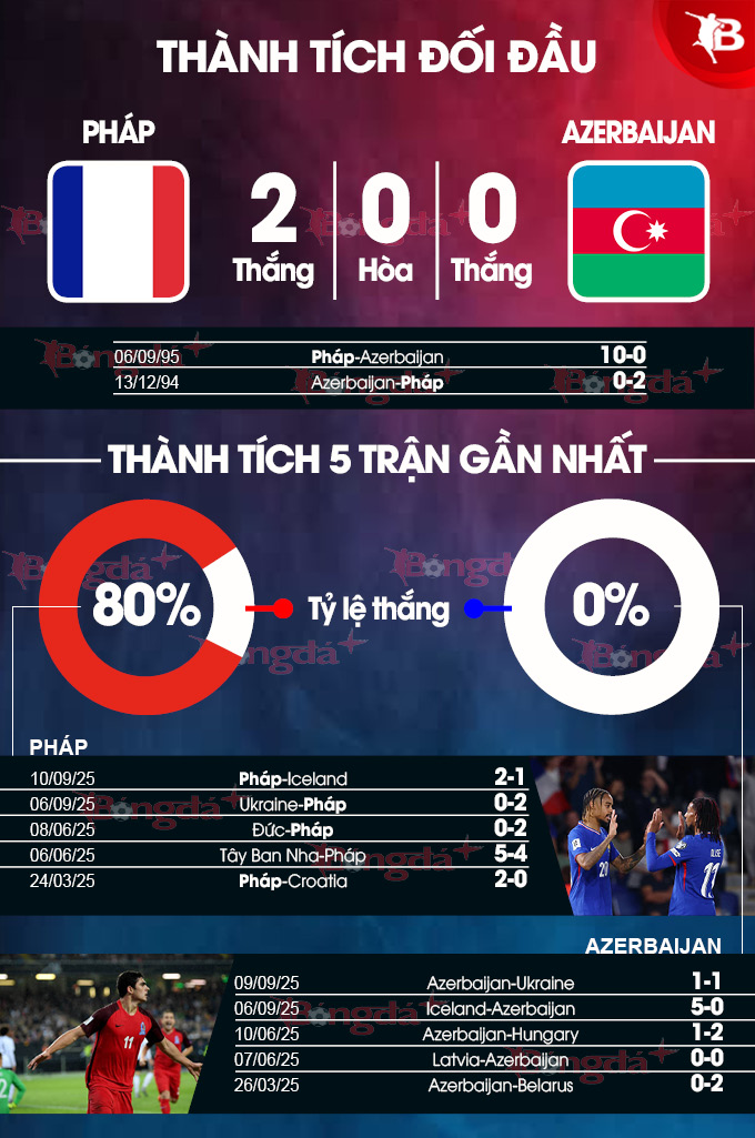 - Pháp giữ sạch lưới nhà: Cả 2 cuộc đối đầu với Azerbaijan đều khép lại bằng những chiến thắng cho Pháp và Les Bleus không để thủng lưới bàn nào. Ngoài ra, thầy trò Didier Deschamps cũng giữ sạch lưới nhà ở 3/4 trận gần đây trên sân nhà. Xem ra, trận này khó có ngoại lệ.