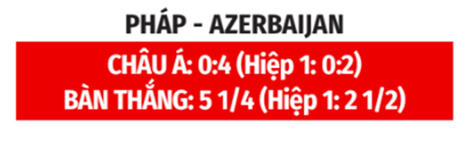 - Pháp thắng theo châu Á: Pháp thắng theo châu Á 7/11 trận gần nhất, thắng 3/4 trận sân nhà vừa qua. Trong khi đó, Azerbaijan thua theo châu Á 10/12 trận gần đây, thua 7/9 chuyến xa nhà gần nhất. Vì thế, những người yêu mến Les Bleus có thể đặt niềm tin vào họ ở cuộc đối đầu lần này.