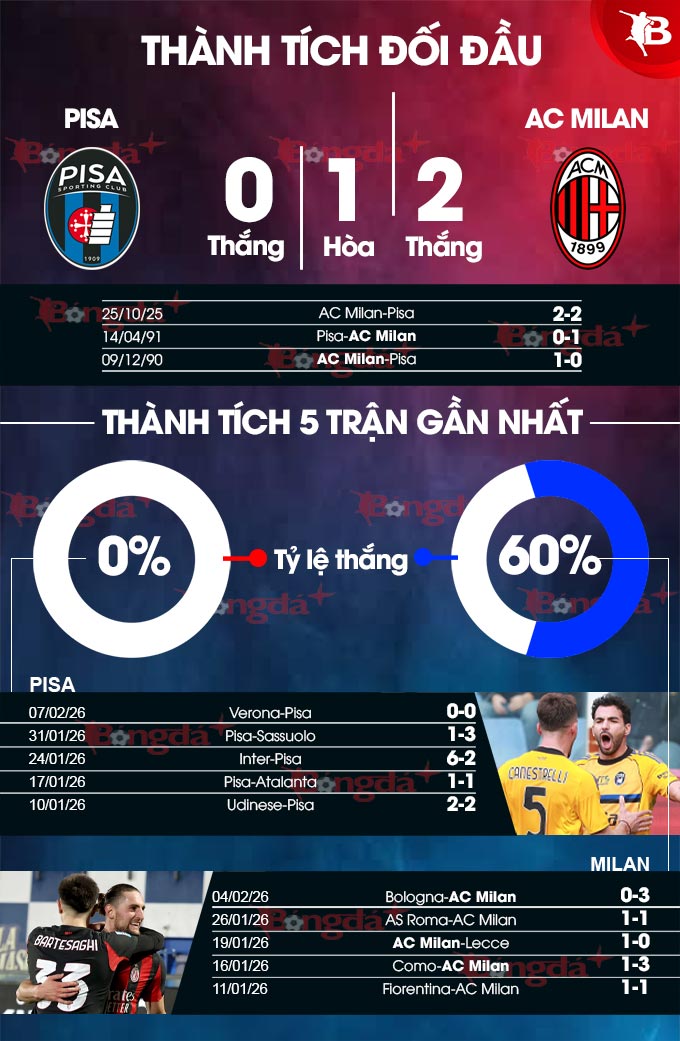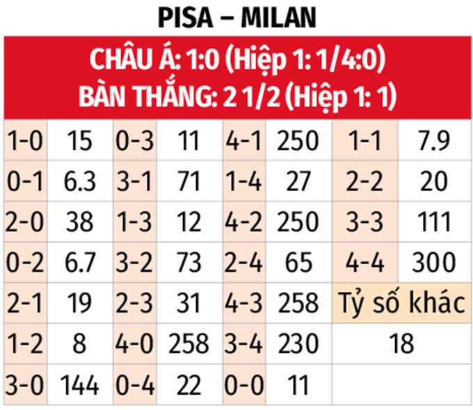 - Ít bàn thắng: Với 19 bàn thắng, Pisa nằm trong nhóm những đội có hàng công tệ nhất giải và họ sẽ đối đầu với AC Milan, đội lại có hàng thủ vững chắc thứ 3 tại Serie A (17 bàn thua). Trong khi đó, các chân sút AC Milan chỉ ghi 38 bàn sau 23 trận, tương đối thấp so với nhóm dẫn đầu. Chính vì thế, kịch bản về một trận cầu khan hiếm bàn thắng là rất khả thi.