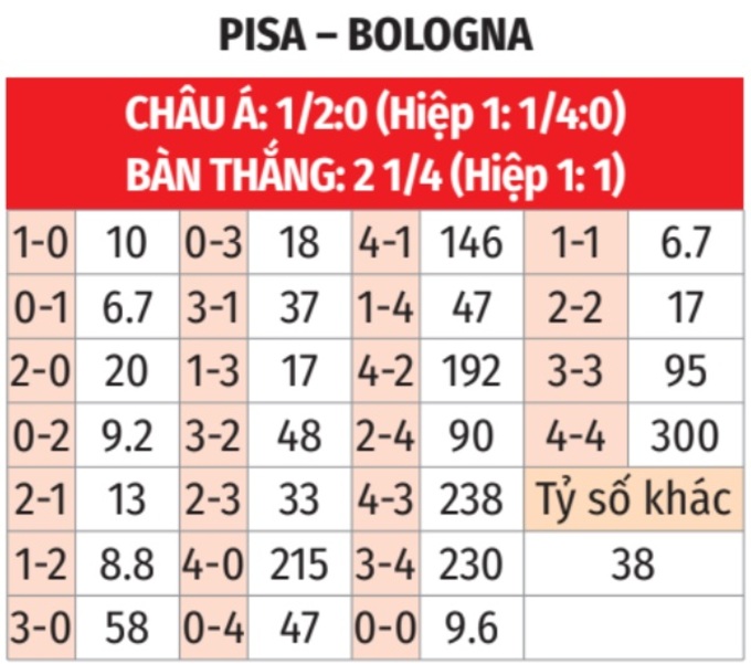 - Ít góc hiệp 1: 3/4 trận đấu gần đây của Pisa chỉ xuất hiện nhiều nhất 4 quả phạt góc trong hiệp 1. Tình trạng tương tự xảy ra ở 5/7 trận đấu vừa qua của Bologna.
