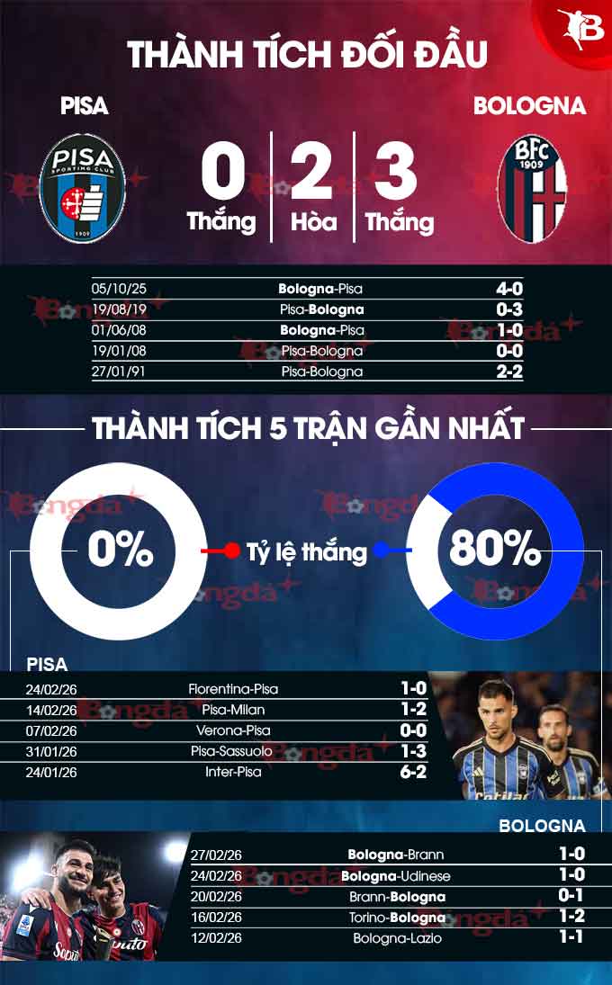 Sân nhà cũng không hẳn là lợi thế của Pisa. Bởi họ chỉ giành được 1 chiến thắng trong 13 lần tiếp đón các đối thủ gần đây, còn lại hòa 4 và có tới 8 lần phải nhận thất bại. Do vậy, các cầu thủ Bologna hoàn toàn có lý do để tin tưởng sẽ giành 3 điểm trong chuyến xuất chinh lần này.