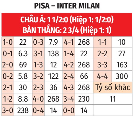 - Inter thắng theo châu Á: Inter vừa thua theo châu Á 4/5 trận chính thức gần đây, trong đó có 2 thất bại liên tiếp trước Milan và Atletico. Ngược lại, Pisa đang gây ấn tượng mạnh cùng HLV Alberto Gilardino, thắng theo châu Á 5 trận liên tiếp. Trong bối cảnh đó Inter vẫn nhường 1 ½ bàn là rất sâu, đội Á quân châu Âu sẽ thắng với cách biệt tối thiểu 2 bàn.
