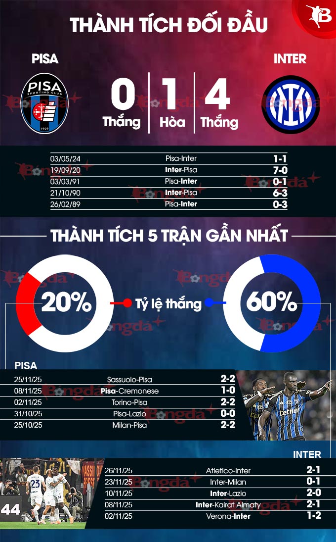 Pisa đang gây ấn tượng mạnh cùng HLV Alberto Gilardino trong lần trở lại Serie A sau 34 năm vắng bóng. Xin lưu ý rằng sau 12 vòng, Pisa có số trận thua là 4, ngang với… Inter. Với 7 trận hòa, từng cầm hòa cả Milan và Atalanta trên sân khách, cũng như chỉ chịu thua sát nút Napoli và Roma, rõ ràng đánh bại Pisa là nhiệm vụ không dễ dàng cho mọi đối thủ.