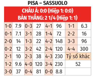 - Từ 2 đến 3 bàn: 4/5 trận sân nhà gần đây của Pisa ở Serie A có từ 2 đến 3 bàn, biến cố tương tự cũng xảy ra ở cả 4 trận sân khách gần nhất của Sassuolo với tỷ lệ châu Á dao động từ 0 đến 3/4.