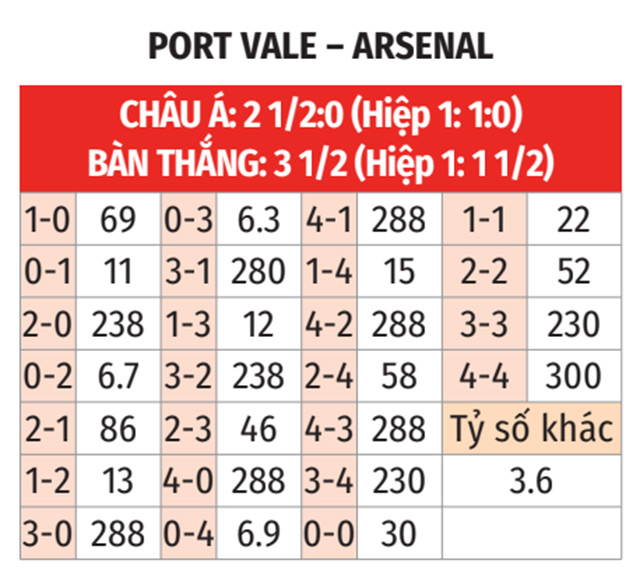 - Tổng bàn thắng lẻ: 8/10 trận gần nhất của Arsenal kết thúc với tỷ số lẻ. 3/4 trận vừa qua của Port Vale cũng có số bàn thắng không chia hết được cho 2.