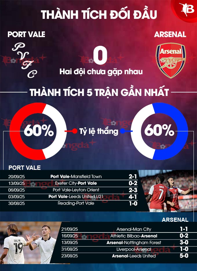 Không như Arsenal đang bay cao, Port Vale lại tỏ ra khá thất thường. Bằng chứng là trong 8 trận gần đây, họ giành được 4 chiến thắng nhưng cũng phải nhận chừng ấy thất bại. Đáng chú ý, trong quá khứ Port Vale chưa từng có cơ hội được chạm trán với Arsenal. Lý do chủ yếu nằm ở chỗ họ chỉ là đại diện tới từ League 1, tương đương với giải hạng 3 ở xứ sở sương mù.