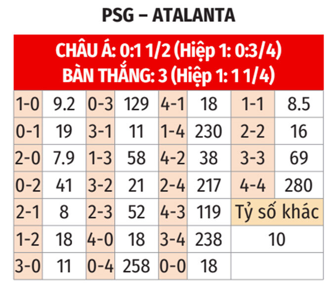 - Lẻ bàn thắng: 3/4 trận gần đây của PSG và 5/7 trận chính thức vừa qua của Atalanta đều có tổng bàn thắng là lẻ. Ngoài ra, 6/9 chuyến làm khách gần đây của Atalanta (trừ giao hữu) cũng khép lại với tổng bàn thắng không chia hết cho 2. Xem ra, kết cục tổng lẻ bàn thắng ở trận này rất dễ tái hiện.