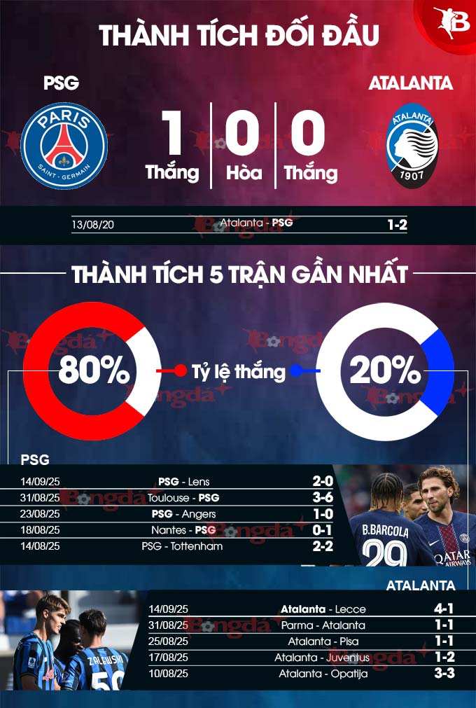 PSG đang gặp những vấn đề như sự mệt mỏi, chấn thương của các trụ cột và chưa tìm lại được phong độ vào phom. Atalanta cũng có cú đề-pa không mấy ưng ý. Tuy nhiên, đẳng cấp của ĐKVĐ Champions League sẽ giúp PSG khởi đầu bằng một chiến thắng nhọc nhằn tại Parc des Princes.