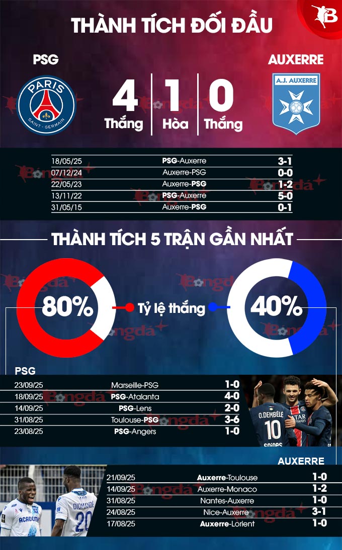 Auxerre chưa từng thắng trận ở 7 trận gần nhất đụng độ với PSG trên mọi đấu trường. Cụ thể, họ hòa 2 và thua 5 ở 7 trận đấu nói trên.