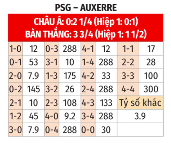 - PSG thua theo châu Á: PSG thua 8, hòa 1, chỉ thắng 1 ở 10 cuộc chạm trán Auxerre gần nhất, thua 5/8 trận gần đây. Ngoài ra, họ cũng thua 5/6 trận sân nhà vừa qua trong các trận đấu thuộc Ligue 1. Nhiều khả năng PSG sẽ thua theo châu Á ở trận này.