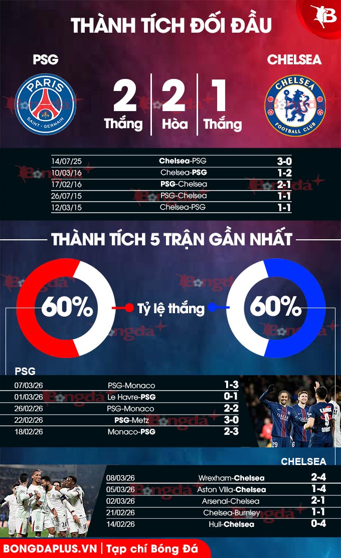 The Blues bước vào cuộc đối đầu với PSG với ký ức đẹp khi từng đánh bại chính đối thủ này với tỷ số 3-0 trong trận chung kết FIFA Club World Cup 2025, nên chắc chắn họ sẽ có tâm lý thoải mái hơn. Tuy nhiên, phong độ không mấy ấn tượng là điểm trừ lớn nhất của Chelsea lúc này.