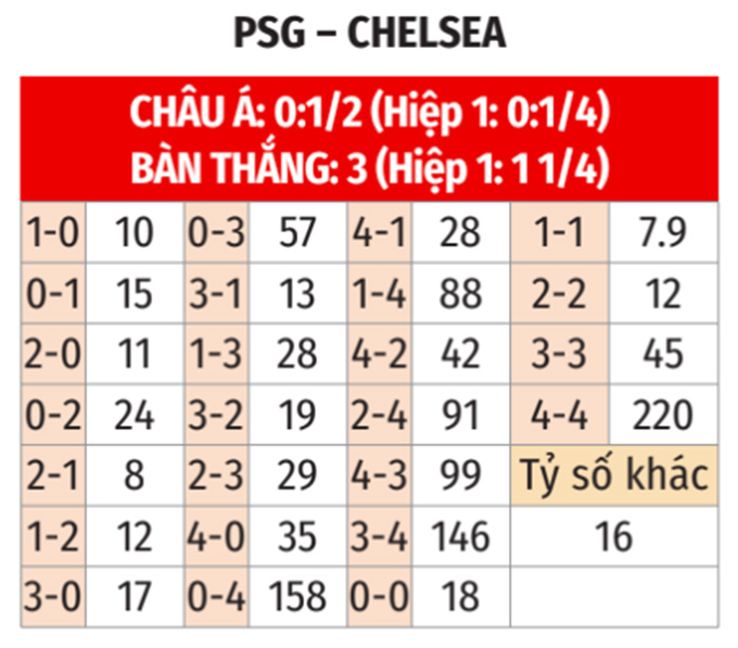 - Từ 4 thẻ phạt trở lên: Xuất hiện tới 28 thẻ phạt ở 5 cuộc chạm trán gần nhất, tương đương 5,6 thẻ/trận. Cũng có tới 21 thẻ phạt ở 5 trận vừa qua của PSG (4,2 thẻ/trận) và 30 thẻ ở 5 trận gần đây của Chelsea (6 thẻ/trận). Do vậy, nhiều khả năng trận này cũng có ít nhất 4 thẻ phạt.
