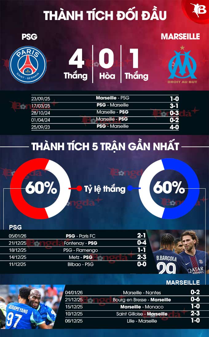 Về phần mình, Marseille vừa thua Nantes 0-2 ngay tại Velodrome ở trận mở màn năm 2026 và lĩnh 2 thẻ đỏ. Đây là thất bại đầu tiên sau khi họ giành 3 chiến thắng liên tiếp trước đó. Hàng công của Marseille, dẫn đầu bởi Mason Greenwood, sẽ hứa hẹn gây ra những khó khăn nhất định cho hàng thủ PSG, nhưng rất có thể khả năng kiểm soát khu vực giữa sân và sự mạch lạc trong tấn công gần đây của đội bóng thủ đô sẽ quyết định kết quả trận đấu.