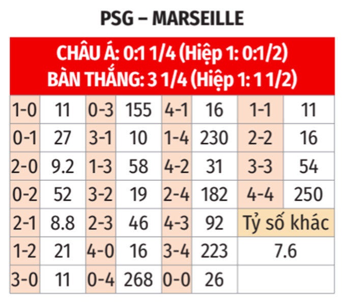 - Hai đội cùng ghi bàn: 8/11 trận gần nhất của PSG và 5/8 trận sân khách gần đây của OM tại Ligue 1 đều có tối thiểu 1 bàn thắng cho mỗi đội. Hơn nữa, PSG ghi được ít nhất 1 bàn ở 19/20 trận vừa qua. Khả năng trận này cũng chứng kiến mỗi đội ghi được 1 bàn thắng.