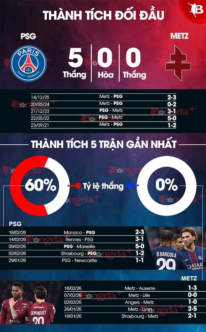 - Tối thiểu 2 bàn hiệp 1: 4/5 cuộc đối đầu gần nhất, 4/5 trận gần đây của PSG và 9/13 chuyến làm khách vừa qua của Metz đều có ít nhất 2 bàn thắng trong hiệp 1. Ngoài ra, 5/8 lần gần nhất PSG đón tiếp Metz tại Ligue 1 cũng đều có kịch bản tương tự trong hiệp 1.