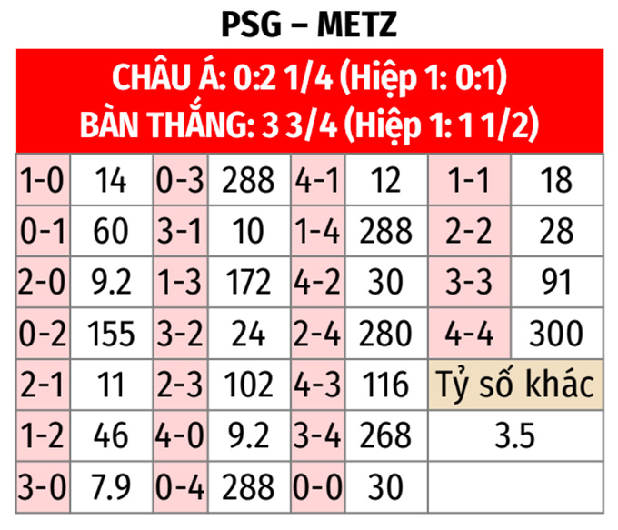 - PSG thắng theo châu Á: PSG thắng 7/9 cuộc đón tiếp Metz gần nhất tại Ligue 1, thắng 4/5 trận sân nhà vừa qua tại Ligue 1. Còn Metz thua 3/4 trận vừa qua. Vì thế, những người yêu mến PSG có thể tin vào họ ở trận này.