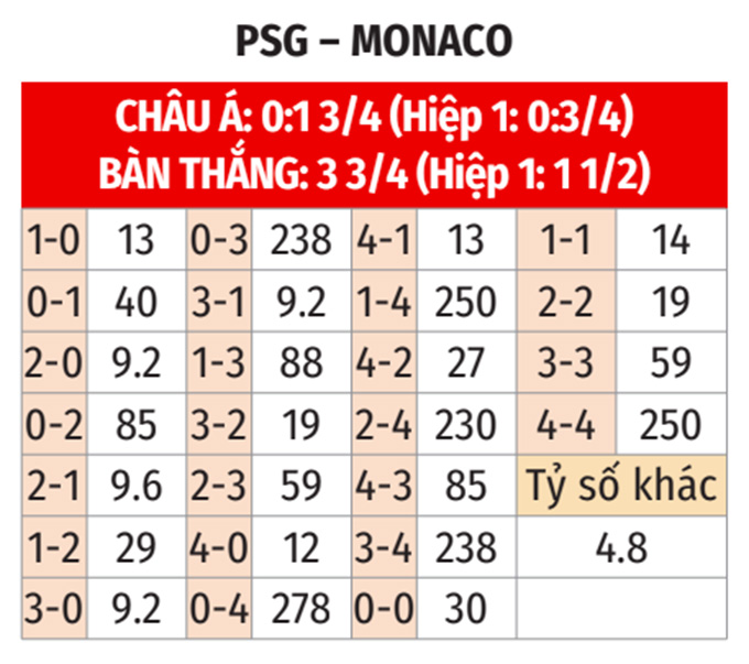 - Lẻ bàn thắng: 5/7 trận đối đầu gần nhất, 8/10 trận gần đây của PSG và cả 2 trận gần đây của Monaco đều có tổng bàn thắng là lẻ. Ngoài ra, cả 3 lần đụng độ gần đây tại Parc des Princes, 9/11 trận sân nhà vừa qua của PSG cũng khép lại với tổng bàn thắng không chia hết cho 2.