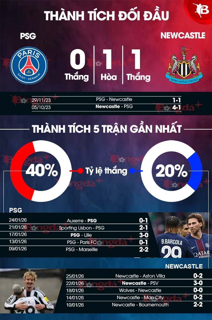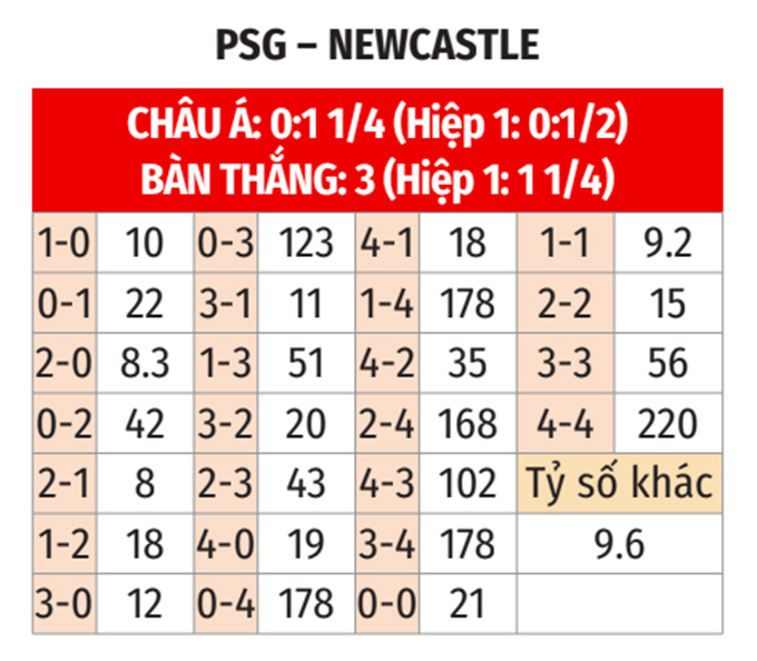 - Hiệp 1 không quá 1 bàn: 7/8 trận gần nhất của PSG đều khép lại với tối đa 1 bàn trong hiệp đấu đầu tiên. Hơn nữa, kịch bản tương tự trong hiệp 1 của Newcastle ở 5/7 trận gần đây. Ngoài ra, cả 3 trận sân nhà vừa qua của PSG và 4/5 chuyến làm khách gần đây của Newcastle cũng đều có tối đa 1 lần lưới rung hiệp 1.