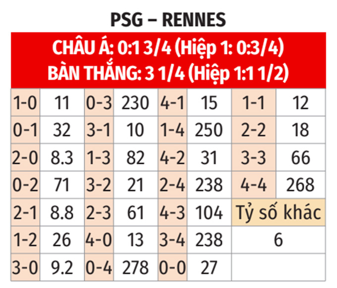 - Lẻ bàn thắng: 5/8 cuộc đối đầu gần nhất tại Parc des Princes, 7/9 trận gần đây của PSG và 5/6 trận vừa qua của Rennes đều khép lại với tổng bàn thắng là lẻ. Ngoài ra, 3/4 trận sân nhà gần đây của PSG cũng có tổng bàn thắng không chia hết cho 2.
