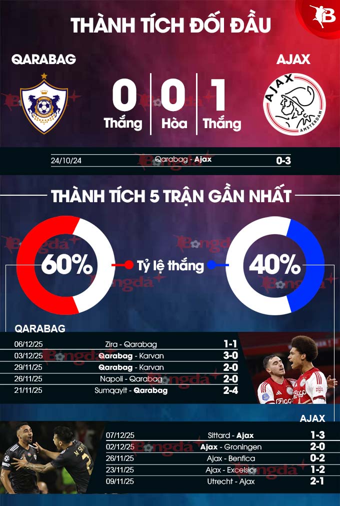 - Tối đa 1 bàn hiệp 1: 7/8 trận gần đây của Ajax cùng trận đối đầu duy nhất giữa hai đội đều có tối đa 1 bàn thắng trong hiệp 1. Với Qarabag, 3/4 trận gần đây của đội chủ nhà kết thúc với tỷ số hòa không bàn thắng trước giờ nghỉ.