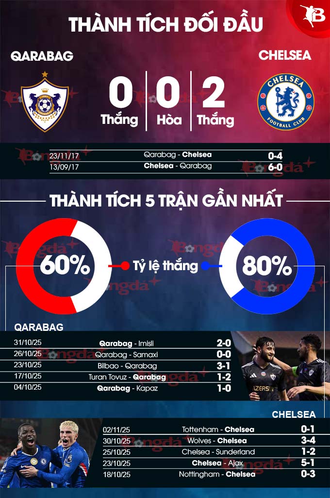 - Không đội nào giữ sạch lưới nhà: Qarabag luôn xuyên thủng lưới đối phương ít nhất 1 lần ở 11/12 trận gần nhất, ở 5/6 trận sân nhà vừa qua. Trong khi đó, 4/6 trận gần đây của Chelsea đều khép lại mà không đội nào giữ sạch lưới nhà. Đặc biệt, Chelsea cũng luôn ghi bàn ở 9/10 chuyến xa nhà vừa qua.