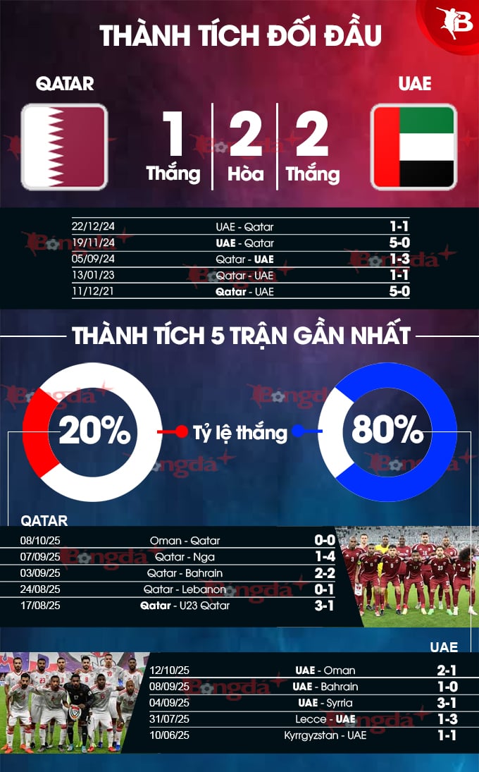 Qatar có lợi thế lớn khi được chơi trên sân nhà ở trận cầu quan trọng này. Tuy nhiên, ở thời điểm hiện tại, UAE lại đang có được phong độ tốt hơn. Đội khách thắng 4/5 trận gần nhất. Trong khi đó, Qatar chỉ thắng 1, hòa 2 và thua đến 2 trận gần đây. 4/5 trận gần nhất gặp nhau, UAE cũng chiếm lợi thế hơn khi thắng 2, hòa 2 và thua 1. Trận thua gần nhất của UAE trước Qatar đã cách đây 4 năm trước. Nhiều khả năng, Qatar sẽ khó lòng có thể vượt qua đối thủ láng giềng đầy khó chịu UAE.