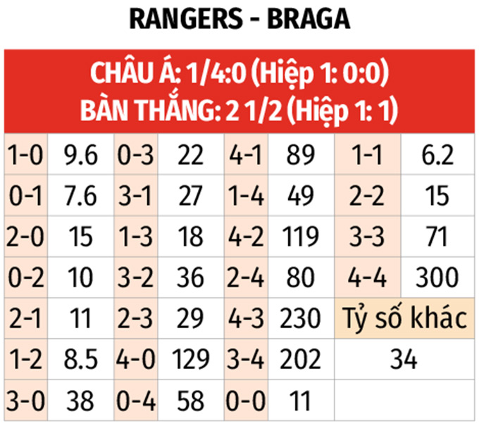 - Ít nhất 1 bàn hiệp 1: 11 trận liên tiếp của Rangers đều có bàn thắng trong hiệp 1, với 5 trận trong số đó có từ 2 bàn trở lên. Với Braga, 7 trận vừa qua của đội khách cùng 3/4 trận đối đầu gần nhất cũng xuất hiện tối thiểu 1 bàn thắng trước giờ nghỉ.