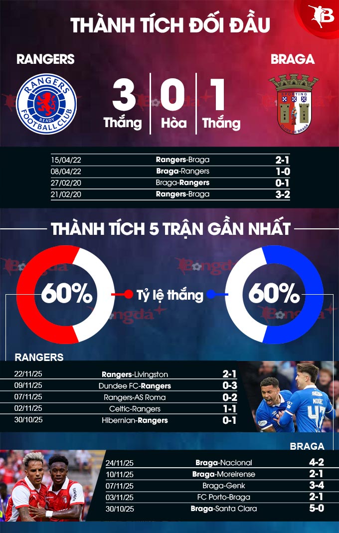 - 3 bàn thắng trở lên: 5/8 trận gần đây của Rangers cùng 6 trận liên tiếp vừa qua của Braga đều có ít nhất 3 bàn thắng được ghi. 2 trận đối đầu gần nhất trên sân nhà của Rangers cũng xuất hiện tối thiểu 3 pha làm bàn.
