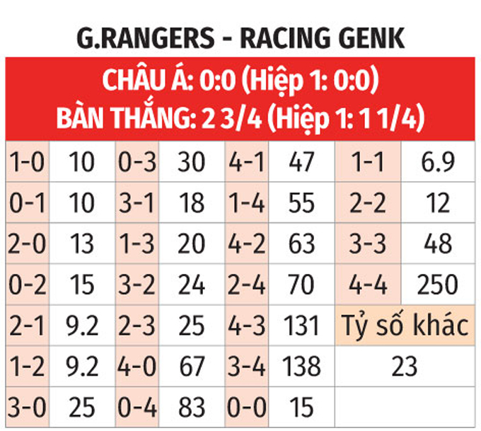 Phong độ của Rangers vs Genk không quá chênh lệch. Rangers có lợi thế sân nhà nhưng Genk đang chơi cực hay ở sân khách. Do đó, có khả năng đại diện của Bỉ sẽ ra về với 3 điểm.