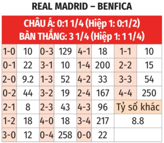 - Tối thiểu 2 bàn hiệp 1: 3/4 lần gặp giữa 2 đội gần đây đều xuất hiện từ 2 bàn trở lên trong hiệp 1. Tình trạng tương tự xảy ra ở 6/8 trận đấu cúp gần đây của Real Madrid và 3/4 trận vừa qua của Benfica.